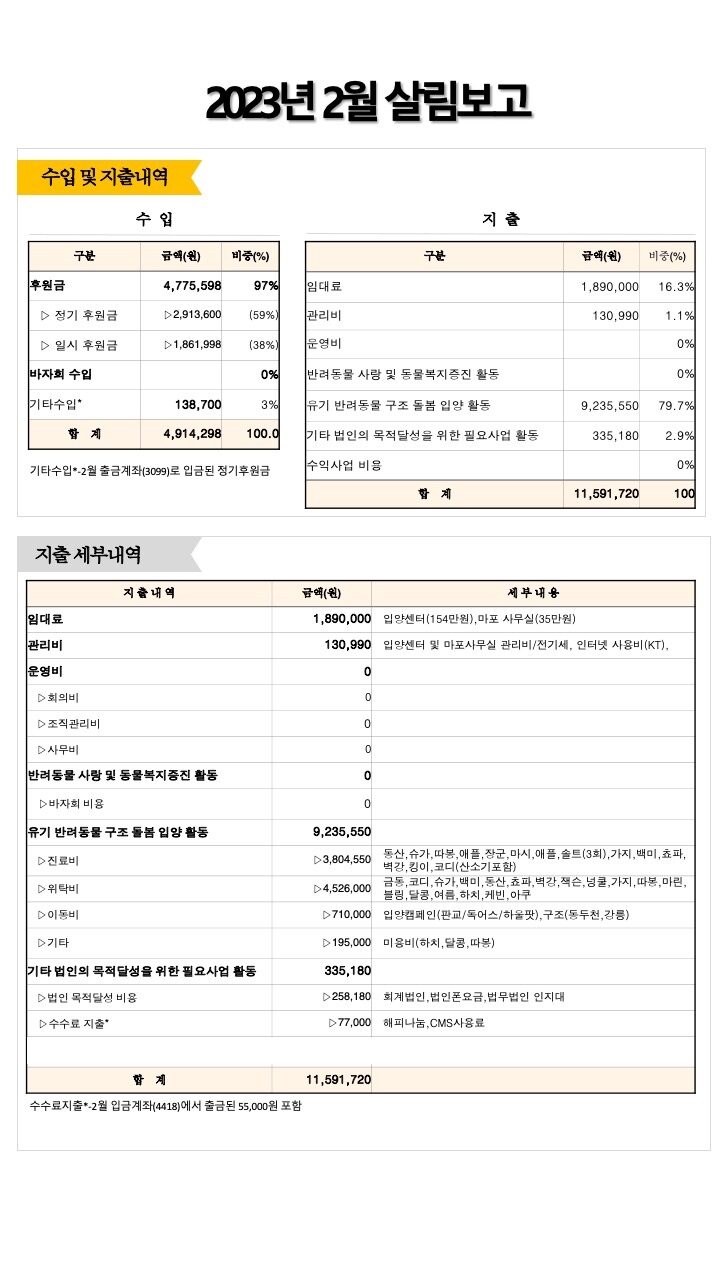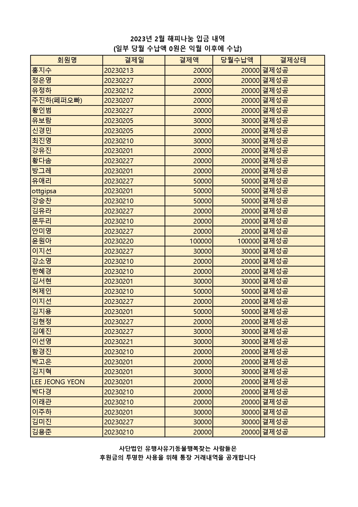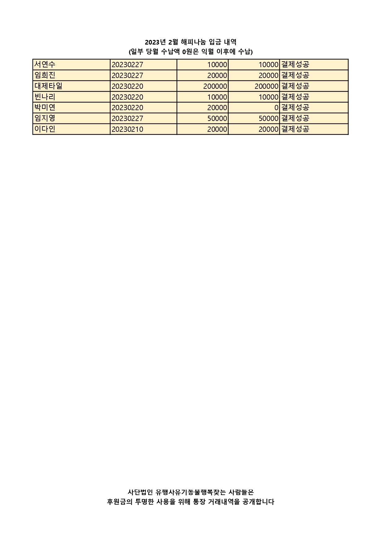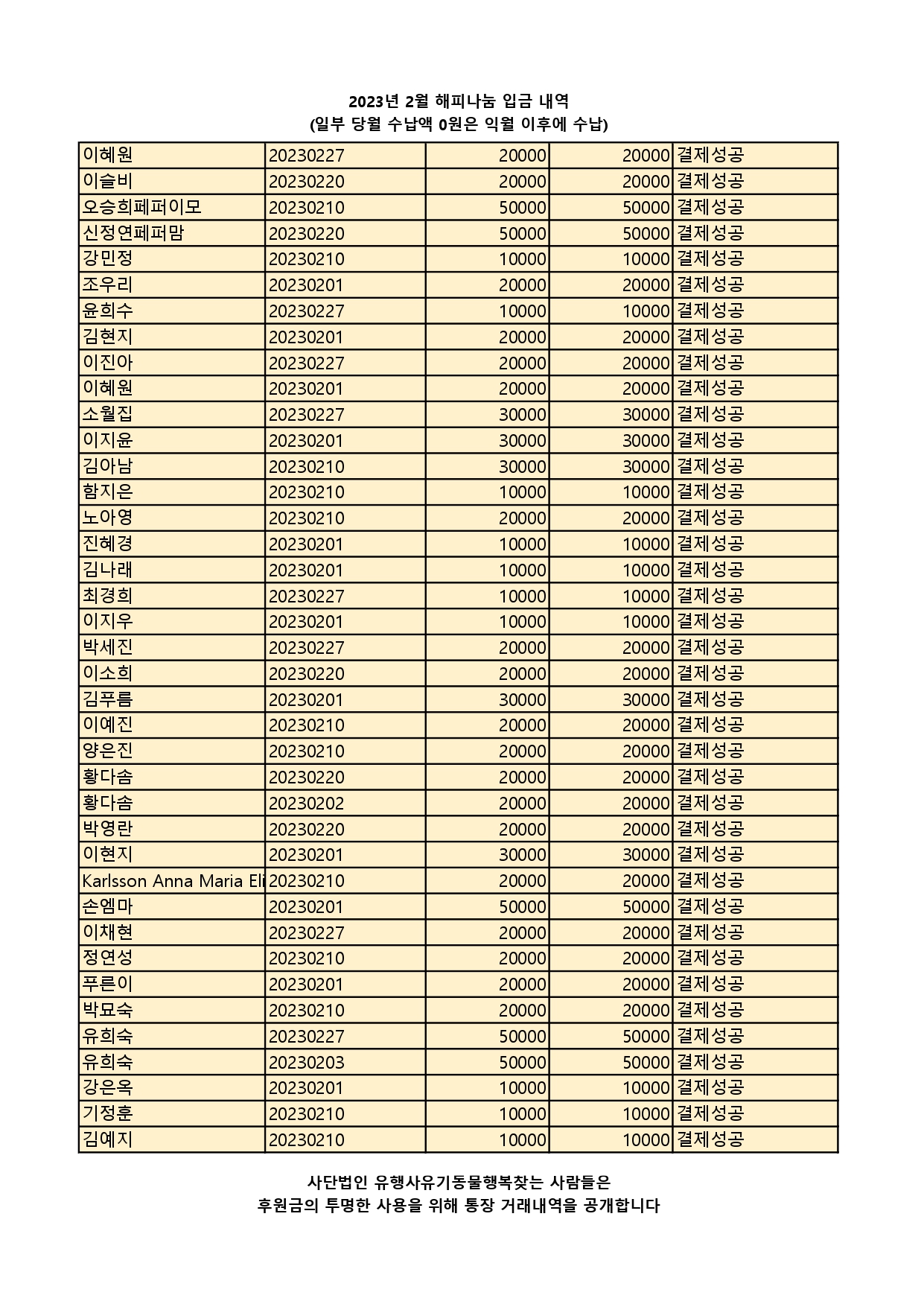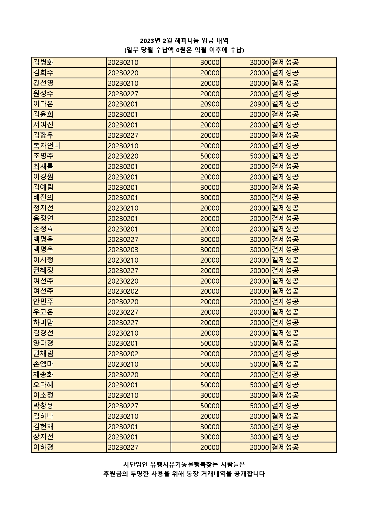 2023.02 해피나눔 입금내역 : 일부 당월수납 = 0은 익월 이후 수납됩니다.