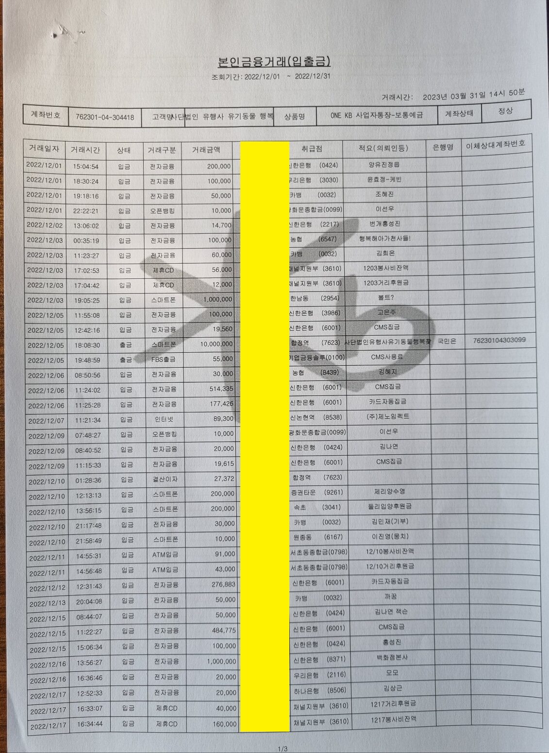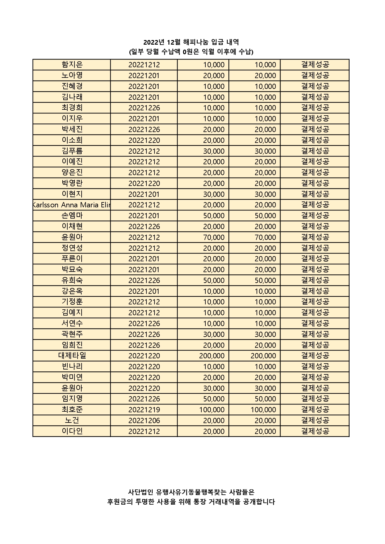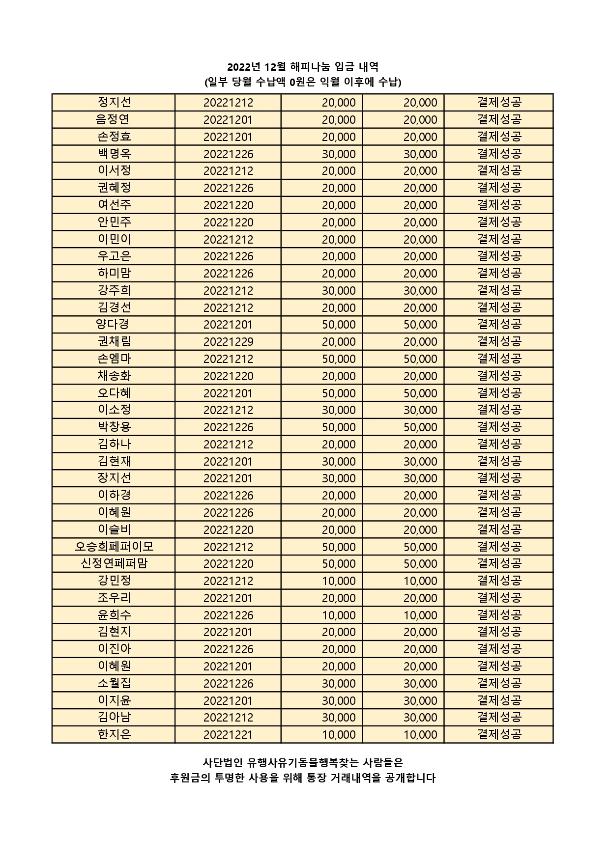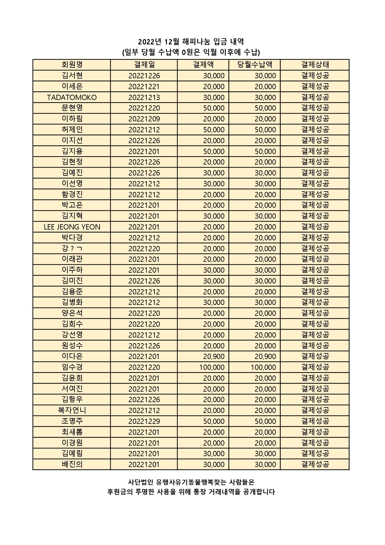2022.12 해피나눔 입금내역 : 일부 당월수납 = 0은 익월 이후 수납됩니다.