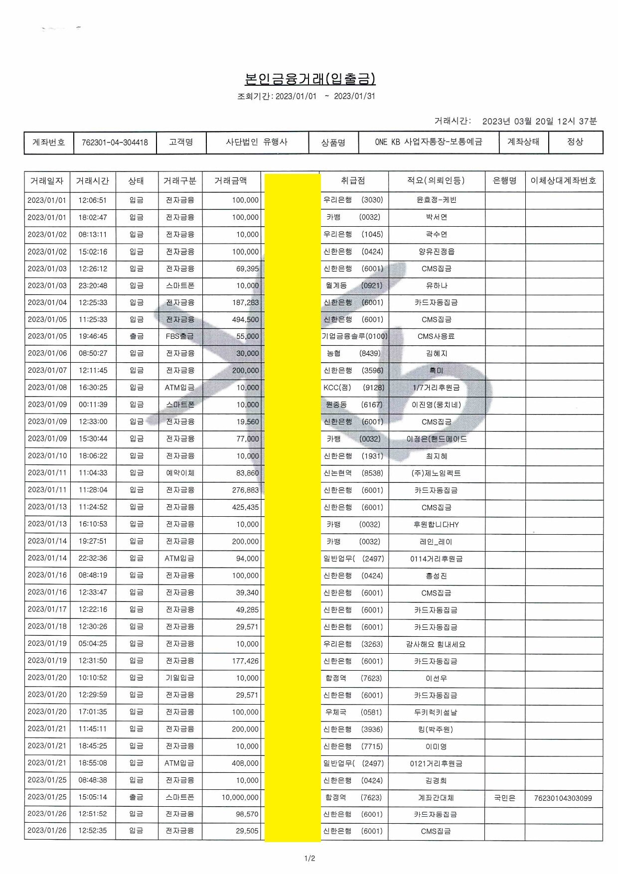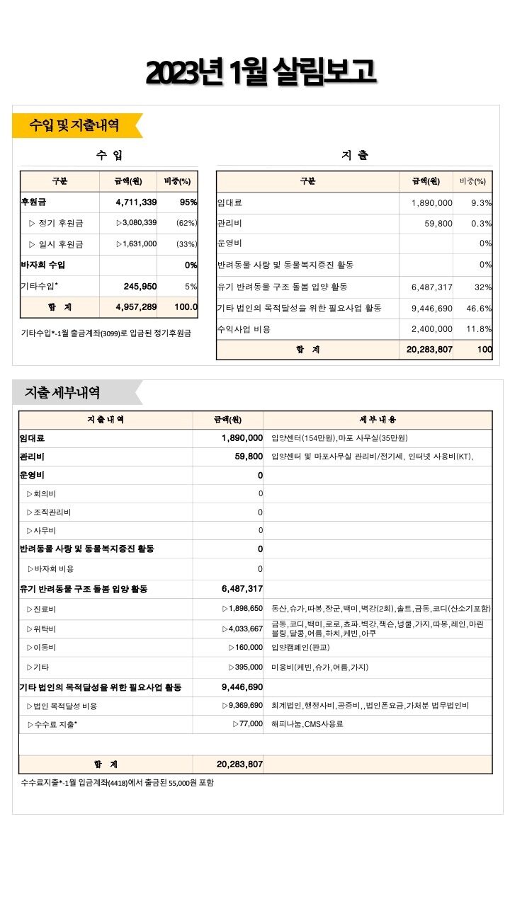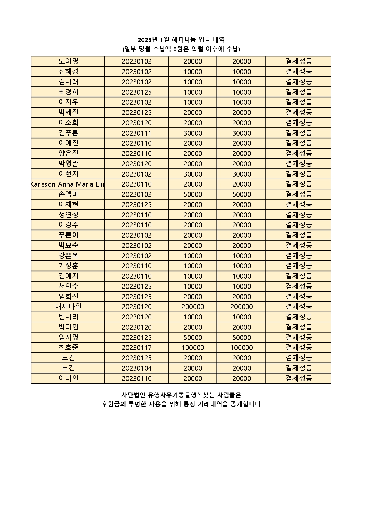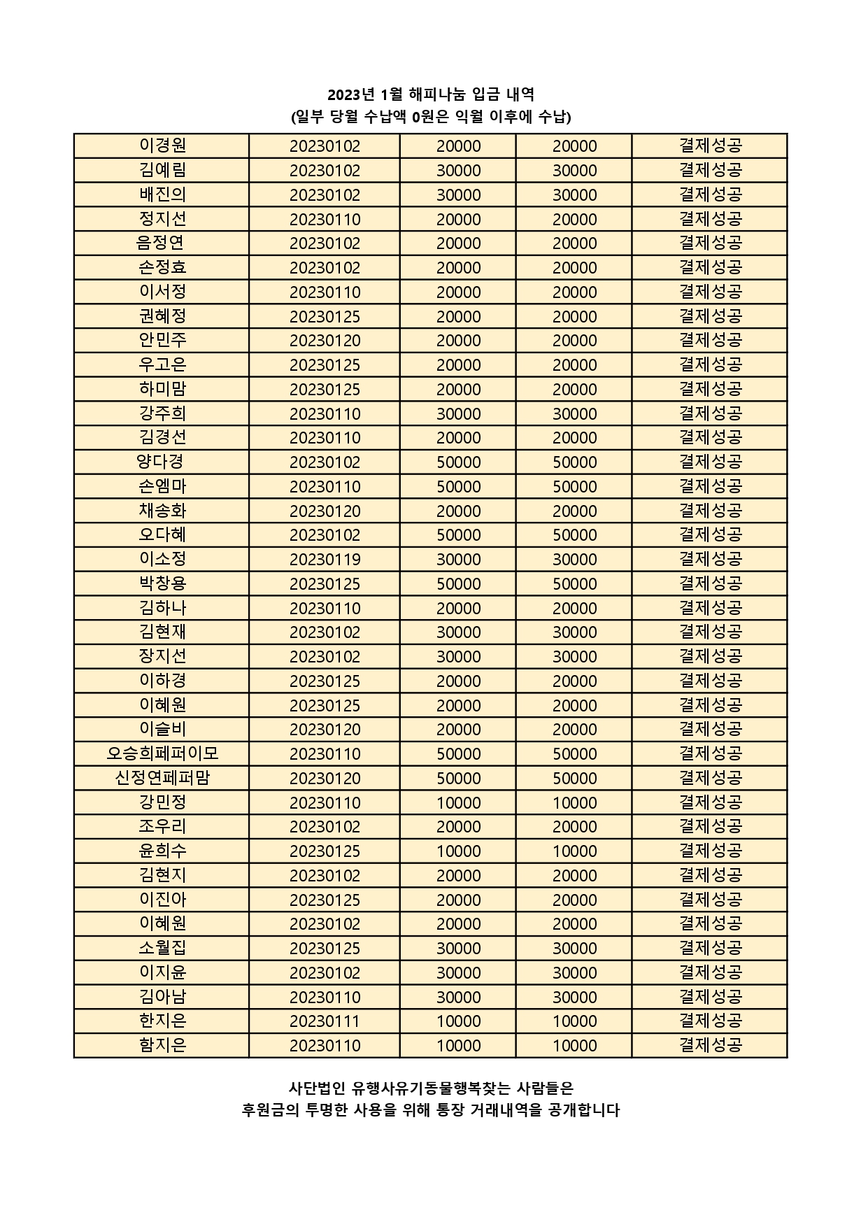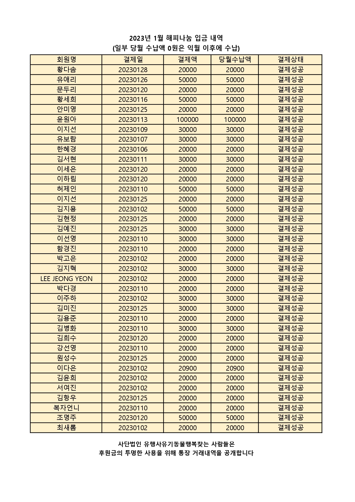 2023.01 해피나눔 입금내역 : 일부 당월수납 = 0은 익월 이후 수납됩니다.