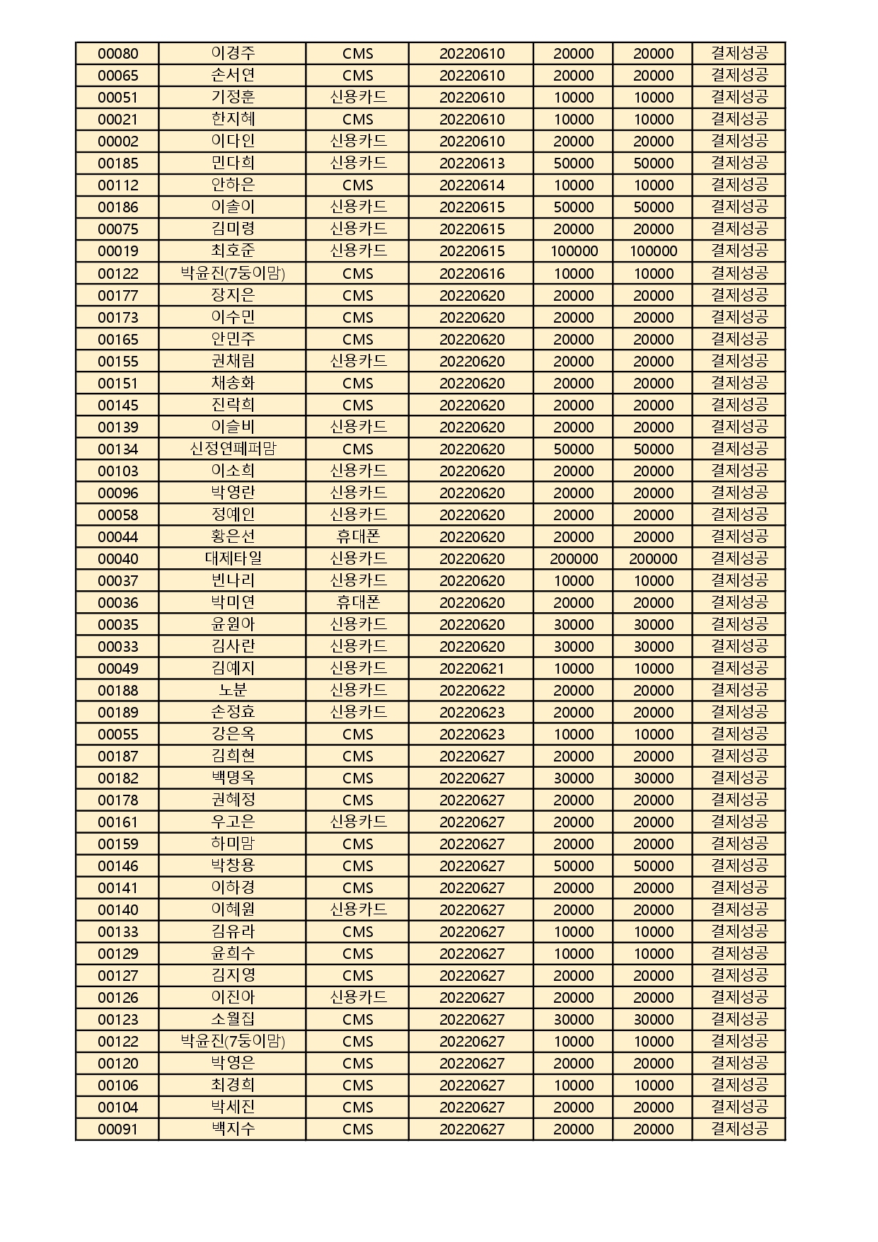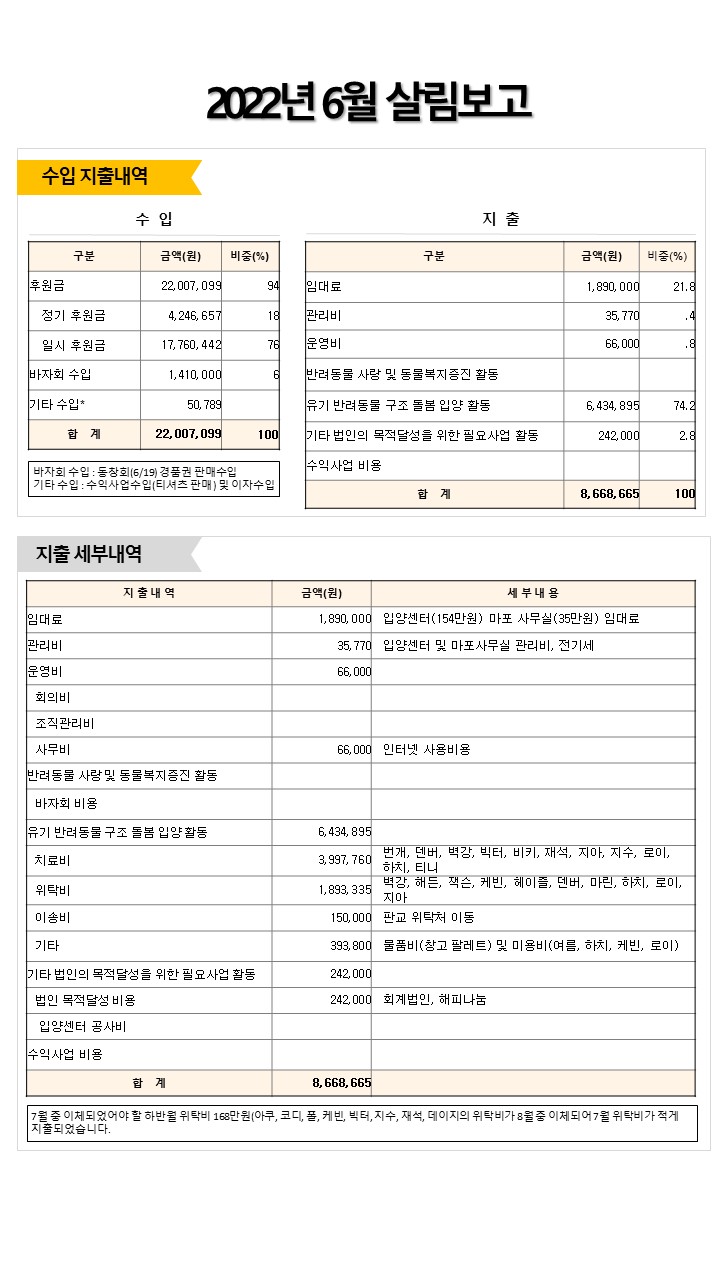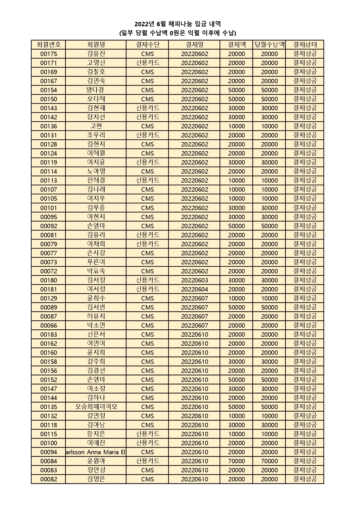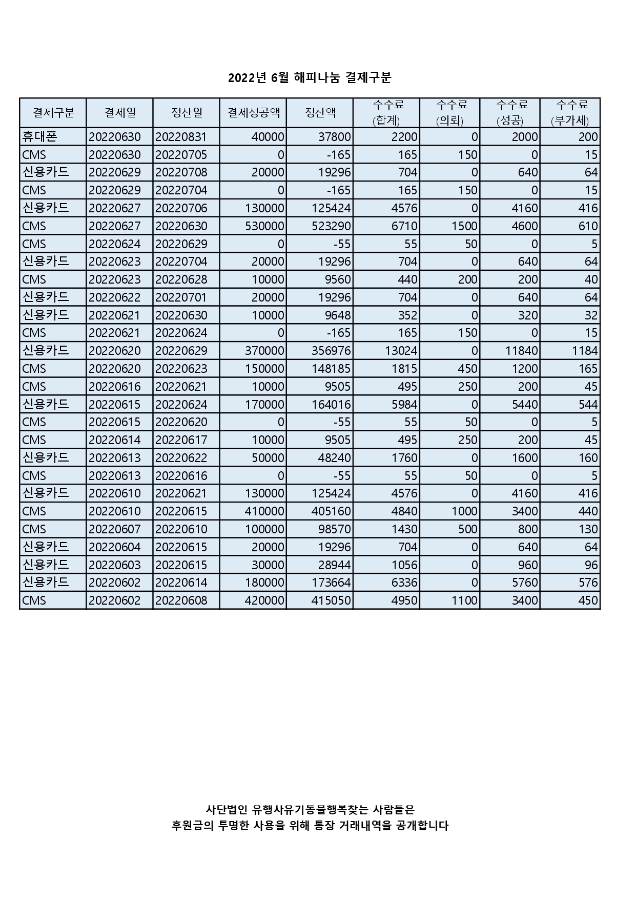 2022.6 해피나눔 입금내역 : 일부 당월수납 = 0은 익월 이후 수납됩니다.